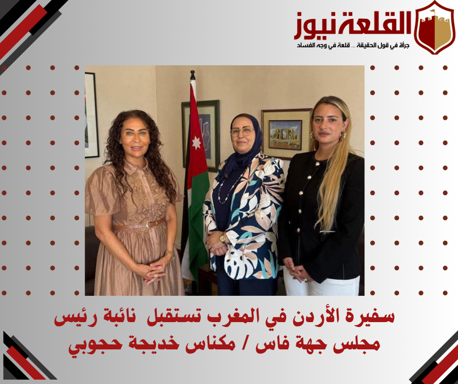 القلعة نيوز- استقبلت سفيرة المملكة الأردنية الهاشمية لدى المملكة المغربية، جمانة غنيمات، بمقر السفارة في الرباط، سعادة النائبة خديجة حجوبي، نائبة رئيس مجلس جهة فاس–مكناس، حيث جاء اللقاء في إطار التحضير للمعرض الاقتصادي الأردني–المغربي المزمع تنظيمه في العاصمة عمّان خلال الفترة المقبلة.