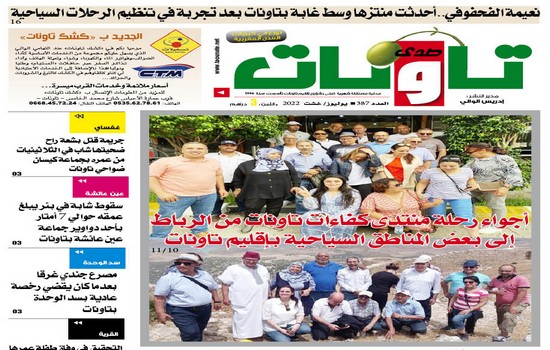 الرباط:”تاونات نت”/- صدر مؤخرا العدد 387 (يوليوز وغشت2022) من جريدة “صدى تاونات” الورقية ، والذي تضمن العديد من الملفات والتقارير الإخبارية والأنباء المحلية على رأسها تقريرا إخباريا حول “تاونات تحتفي بالذكرى 65 لإنشاء طريق الوحدة بحضور المندوب السامي للمقاومة وأعضاء جيش التحرير” والتغطية الإعلامية حول “الكاتب العام لعمالة تاونات عبد الحق غلاب يستقبل أعضاء جمعية فردوس لمساندة مرضى السرطان بإقليم تاونات”وتغطية ل” دراسة 171 مشروعا من طرف اللجنة الإقليمية للتنمية الاقتصادية في إطار INDH بإقليم تاونات‎‎” وتغطية ل” المجلس الإقليمي للغابات يعقد دورته الربيعية والمدير الإقليمي يسجل أن متوسط حرائق الغابات بتاونات يقدر ب 12.6 حريق في السنة”.
